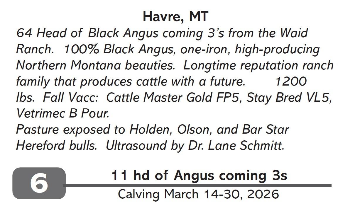 64 Head of Black Angus coming 3’s from the Waid Ranch. 100% Black Angus, one-iron, high-producing Northern Montana beauties. Longtime reputation ranch family that produces cattle with a future. 1200 lbs. Fall Vacc: Cattle Master Gold FP5, Stay Bred VL5, Vetrimec B Pour.