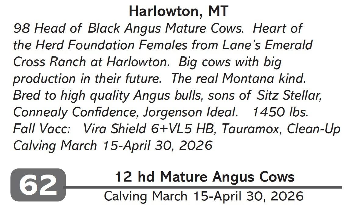 98 Head of Black Angus Mature Cows. Heart of the Herd Foundation Females from Lane’s Emerald Cross Ranch at Harlowton. Big cows with big production in their future. The real Montana kind. Bred to high quality Angus bulls, sons of Sitz Stellar, Connealy Confidence, Jorgenson Ideal. 1450 lbs. Fall Vacc: Vira Shield 6+VL5 HB, Tauramox, Clean-Up Calving March 15-April 30, 2026