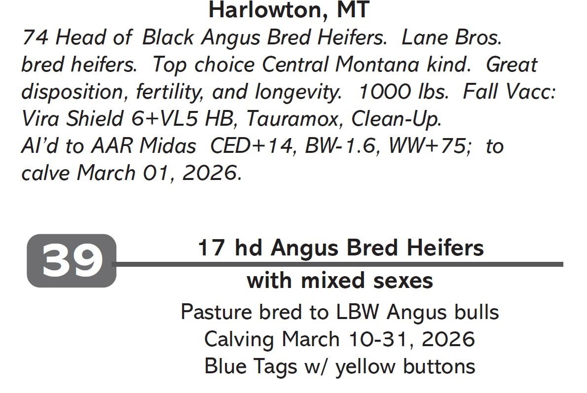 74 Head of Black Angus Bred Heifers. Lane Bros. bred heifers. Top choice Central Montana kind. Great disposition, fertility, and longevity. 1000 lbs. Fall Vacc: Vira Shield 6+VL5 HB, Tauramox, Clean-Up.