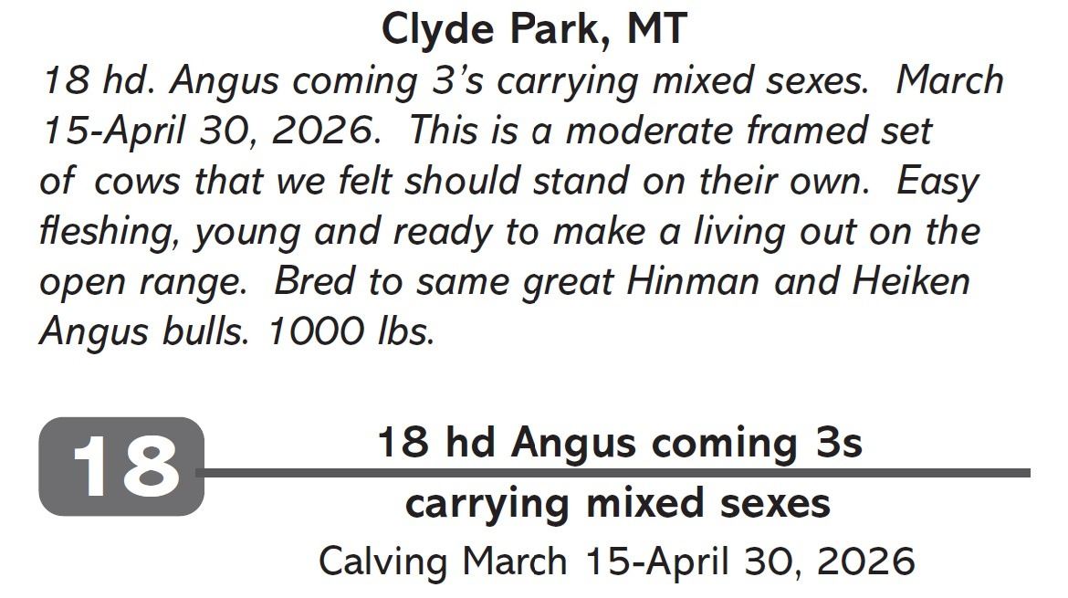 18 hd. Angus coming 3’s carrying mixed sexes. March 15-April 30, 2026. This is a moderate framed set of cows that we felt should stand on their own. Easy fleshing, young and ready to make a living out on the open range. Bred to same great Hinman and Heiken Angus bulls. 1000 lbs.
