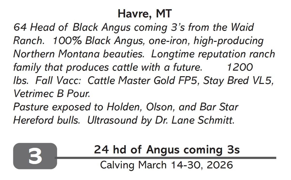 64 Head of Black Angus coming 3’s from the Waid Ranch. 100% Black Angus, one-iron, high-producing Northern Montana beauties. Longtime reputation ranch family that produces cattle with a future. 1200 lbs. Fall Vacc: Cattle Master Gold FP5, Stay Bred VL5, Vetrimec B Pour.