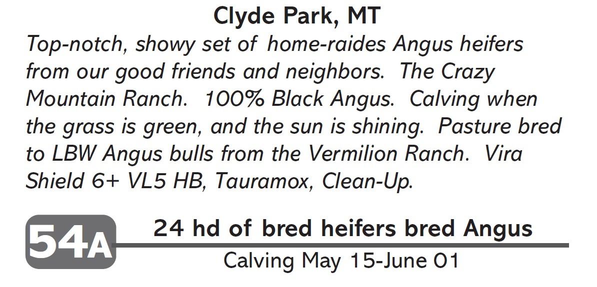 Top-notch, showy set of home-raides Angus heifers from our good friends and neighbors. The Crazy Mountain Ranch. 100% Black Angus. Calving when the grass is green, and the sun is shining. Pasture bred to LBW Angus bulls from the Vermilion Ranch. Vira Shield 6+ VL5 HB, Tauramox, Clean-Up.