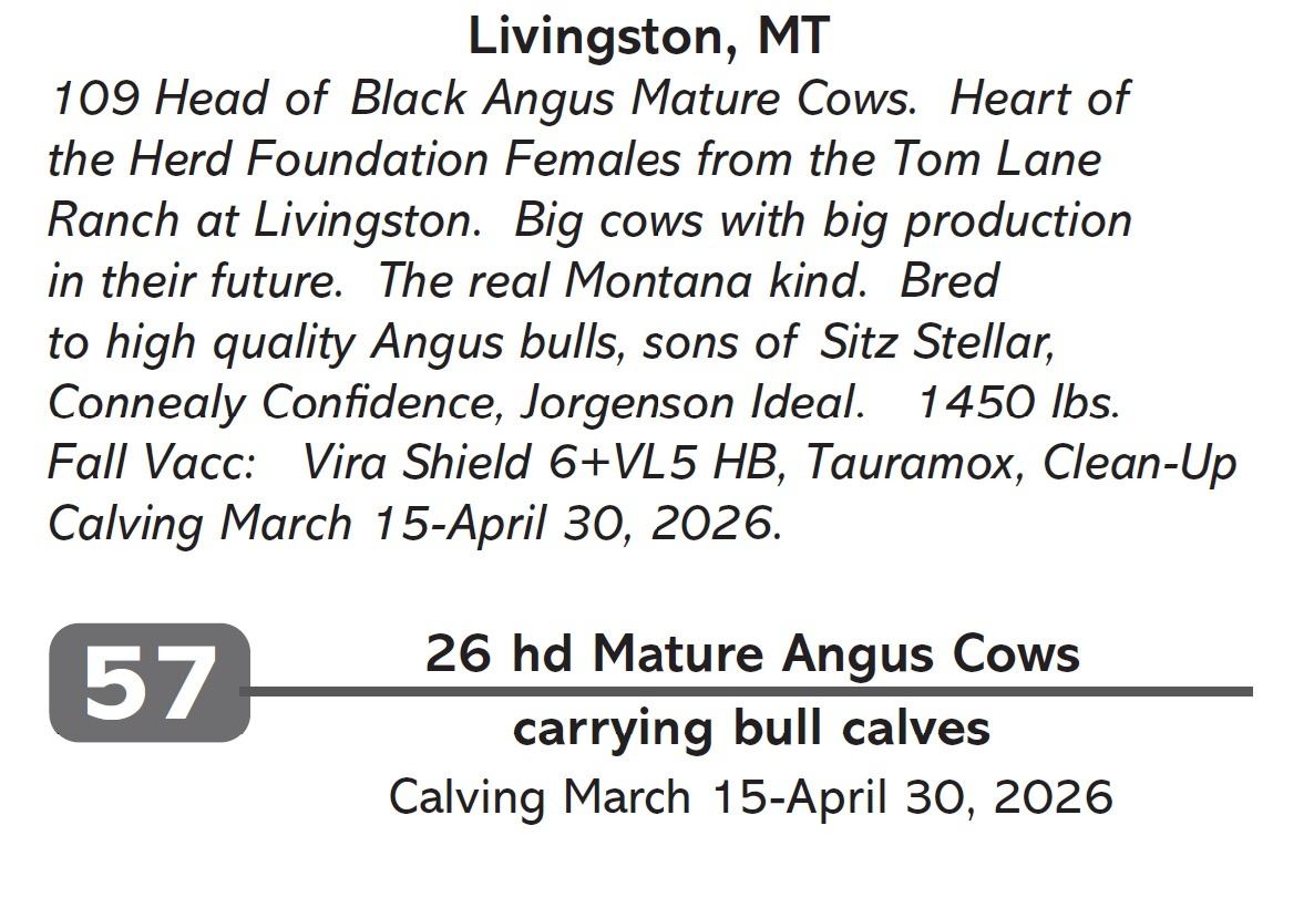 109 Head of Black Angus Mature Cows. Heart of the Herd Foundation Females from the Tom Lane Ranch at Livingston. Big cows with big production in their future. The real Montana kind. Bred to high quality Angus bulls, sons of Sitz Stellar, Connealy Confidence, Jorgenson Ideal. 1450 lbs. Fall Vacc: Vira Shield 6+VL5 HB, Tauramox, Clean-Up Calving March 15-April 30, 2026.