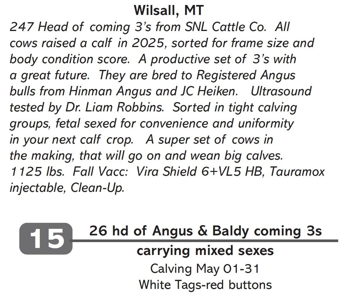 247 Head of coming 3’s from SNL Cattle Co. All cows raised a calf in 2025, sorted for frame size and body condition score. A productive set of 3’s with a great future. They are bred to Registered Angus bulls from Hinman Angus and JC Heiken. Ultrasound tested by Dr. Liam Robbins. Sorted in tight calving groups, fetal sexed for convenience and uniformity in your next calf crop. A super set of cows in the making, that will go on and wean big calves. 1125 lbs. Fall Vacc: Vira Shield 6+VL5 HB, Tauramox injectable, Clean-Up.