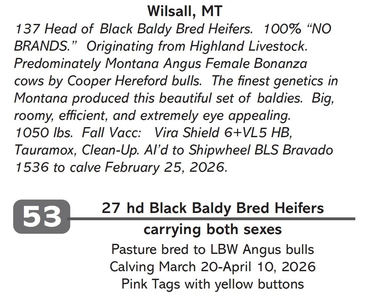 137 Head of Black Baldy Bred Heifers. 100% “NO BRANDS.” Originating from Highland Livestock. Predominately Montana Angus Female Bonanza cows by Cooper Hereford bulls. The finest genetics in Montana produced this beautiful set of baldies. Big, roomy, efficient, and extremely eye appealing.