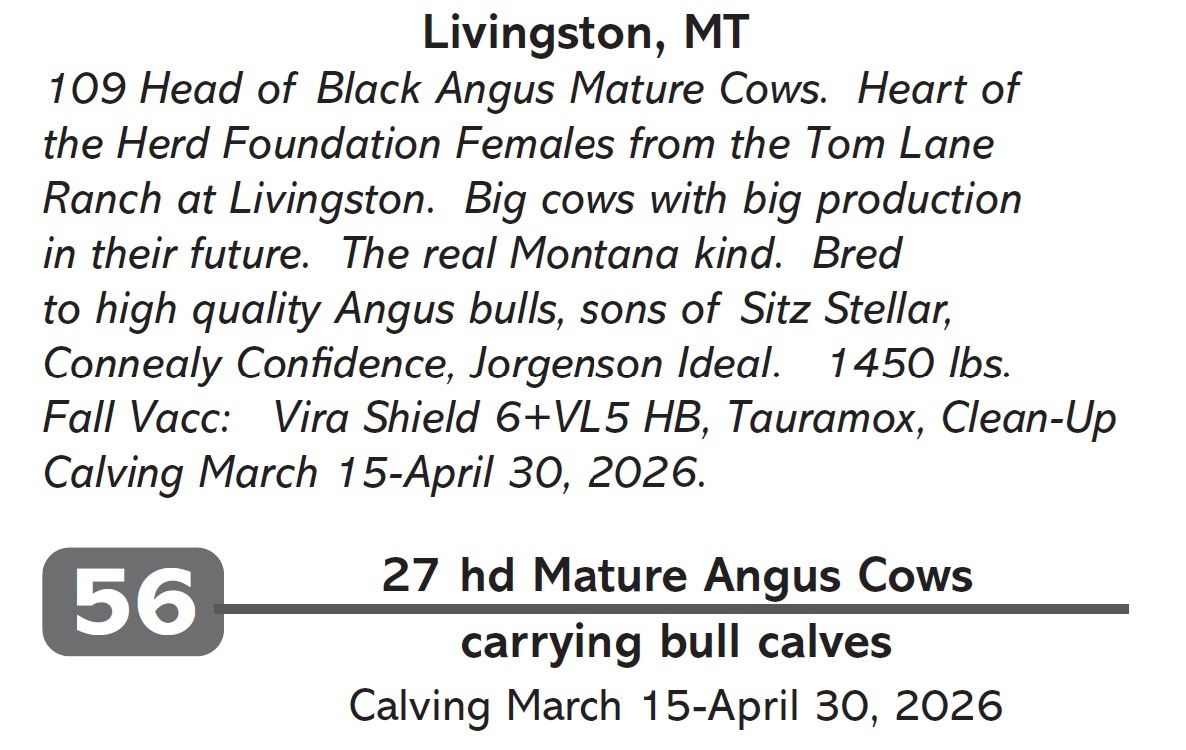109 Head of Black Angus Mature Cows. Heart of the Herd Foundation Females from the Tom Lane Ranch at Livingston. Big cows with big production in their future. The real Montana kind. Bred to high quality Angus bulls, sons of Sitz Stellar, Connealy Confidence, Jorgenson Ideal. 1450 lbs. Fall Vacc: Vira Shield 6+VL5 HB, Tauramox, Clean-Up Calving March 15-April 30, 2026.