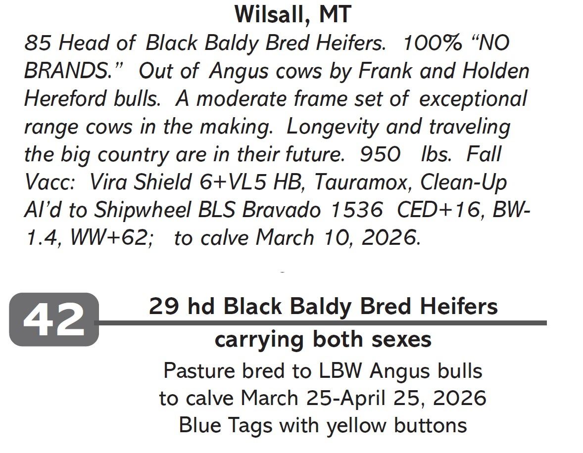85 Head of Black Baldy Bred Heifers. 100% “NO BRANDS.” Out of Angus cows by Frank and Holden Hereford bulls. A moderate frame set of exceptional range cows in the making. Longevity and traveling the big country are in their future. 950 lbs. Fall Vacc: Vira Shield 6+VL5 HB, Tauramox, Clean-Up AI’d to Shipwheel BLS Bravado 1536 CED+16, BW-1.4, WW+62; to calve March 10, 2026.