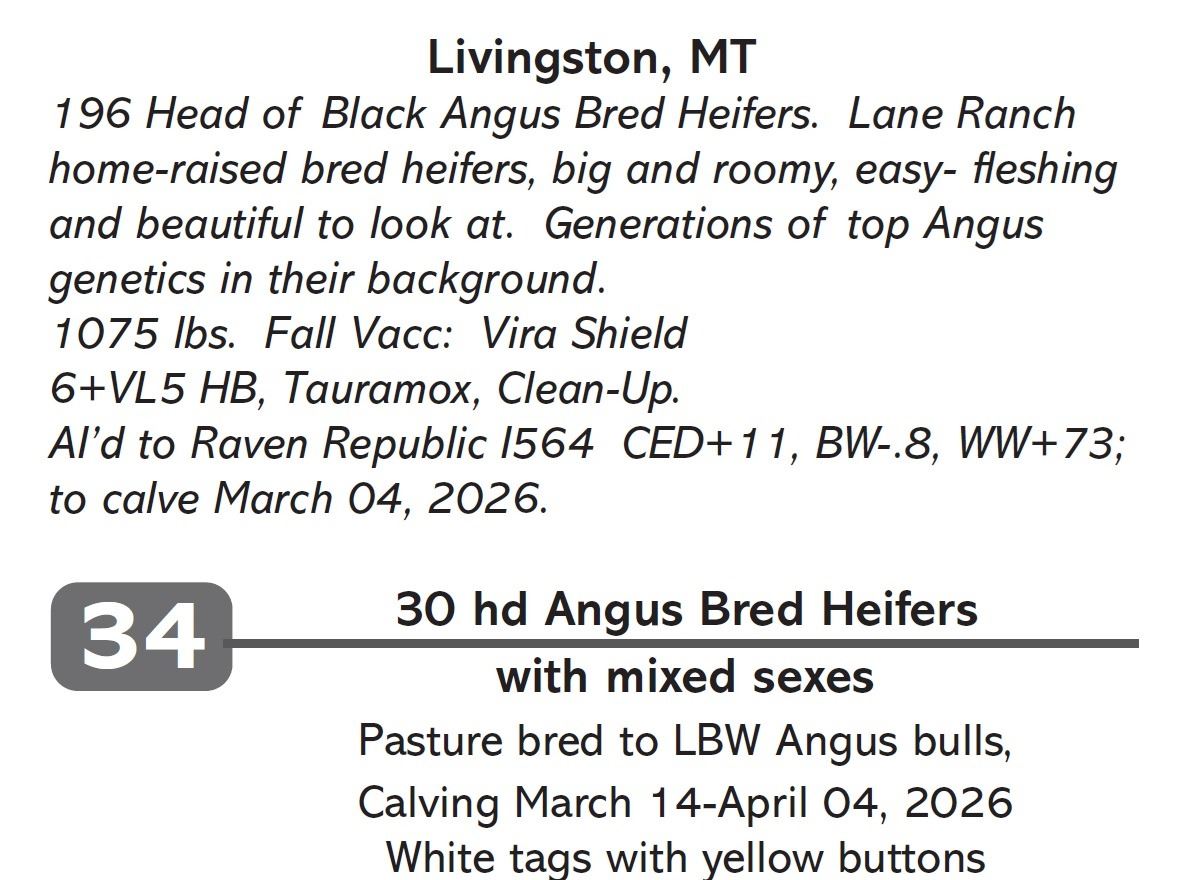 196 Head of Black Angus Bred Heifers. Lane Ranch home-raised bred heifers, big and roomy, easy- fleshing and beautiful to look at. Generations of top Angus genetics in their background.