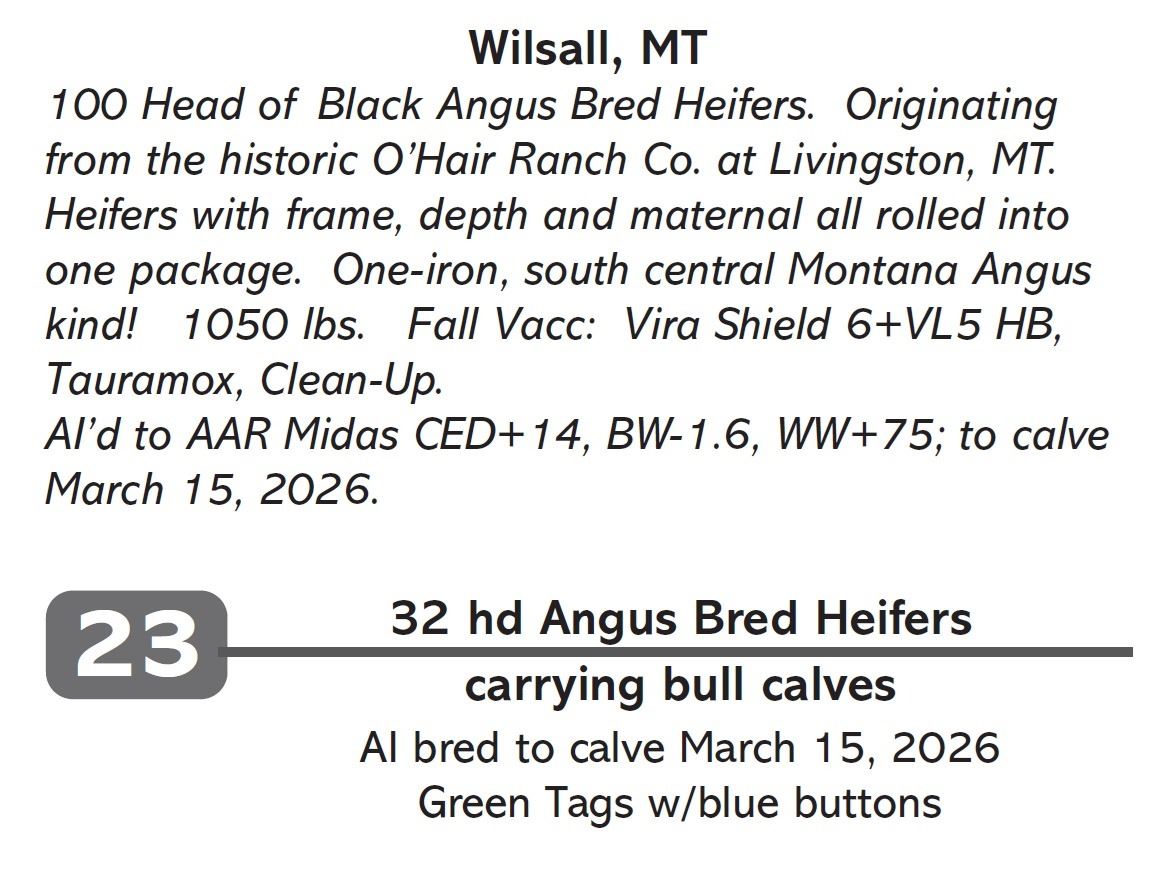 100 Head of Black Angus Bred Heifers. Originating from the historic O’Hair Ranch Co. at Livingston, MT. Heifers with frame, depth and maternal all rolled into one package. One-iron, south central Montana Angus kind! 1050 lbs. Fall Vacc: Vira Shield 6+VL5 HB, Tauramox, Clean-Up.