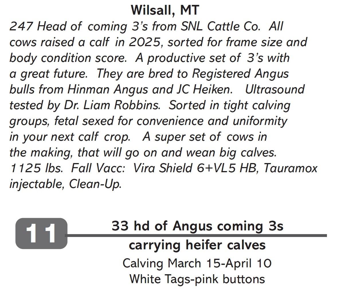247 Head of coming 3’s from SNL Cattle Co. All cows raised a calf in 2025, sorted for frame size and body condition score. A productive set of 3’s with a great future. They are bred to Registered Angus bulls from Hinman Angus and JC Heiken. Ultrasound tested by Dr. Liam Robbins. Sorted in tight calving groups, fetal sexed for convenience and uniformity in your next calf crop. A super set of cows in the making, that will go on and wean big calves. 1125 lbs. Fall Vacc: Vira Shield 6+VL5 HB, Tauramox injectable, Clean-Up.