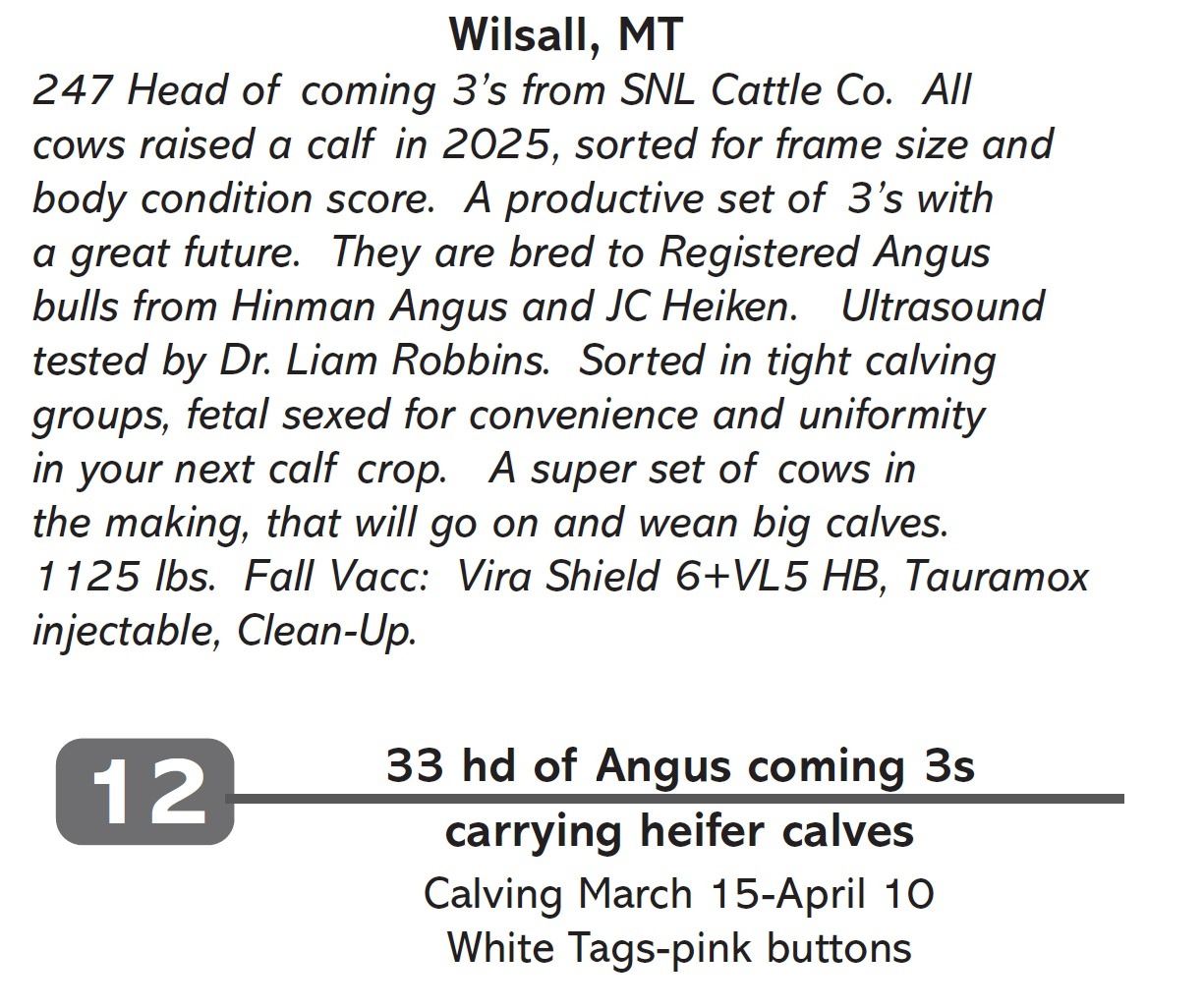 247 Head of coming 3’s from SNL Cattle Co. All cows raised a calf in 2025, sorted for frame size and body condition score. A productive set of 3’s with a great future. They are bred to Registered Angus bulls from Hinman Angus and JC Heiken. Ultrasound tested by Dr. Liam Robbins. Sorted in tight calving groups, fetal sexed for convenience and uniformity in your next calf crop. A super set of cows in the making, that will go on and wean big calves. 1125 lbs. Fall Vacc: Vira Shield 6+VL5 HB, Tauramox injectable, Clean-Up.