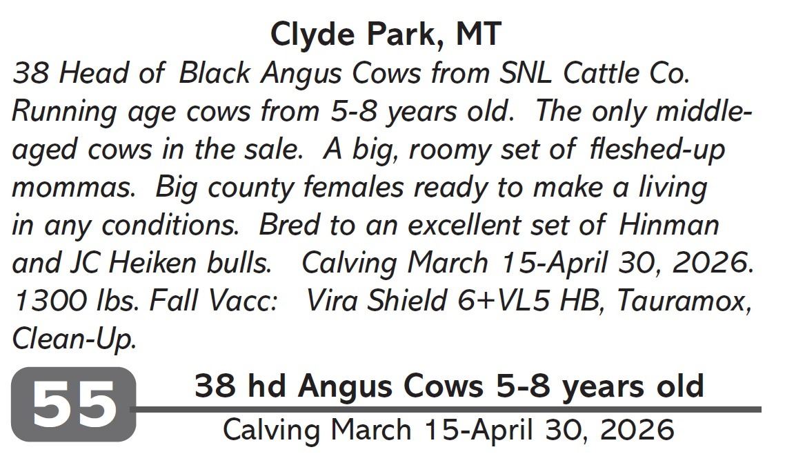 38 Head of Black Angus Cows from SNL Cattle Co. Running age cows from 5-8 years old. The only middle-aged cows in the sale. A big, roomy set of fleshed-up mommas. Big county females ready to make a living in any conditions. Bred to an excellent set of Hinman and JC Heiken bulls. Calving March 15-April 30, 2026. 1300 lbs. Fall Vacc: Vira Shield 6+VL5 HB, Tauramox, Clean-Up.