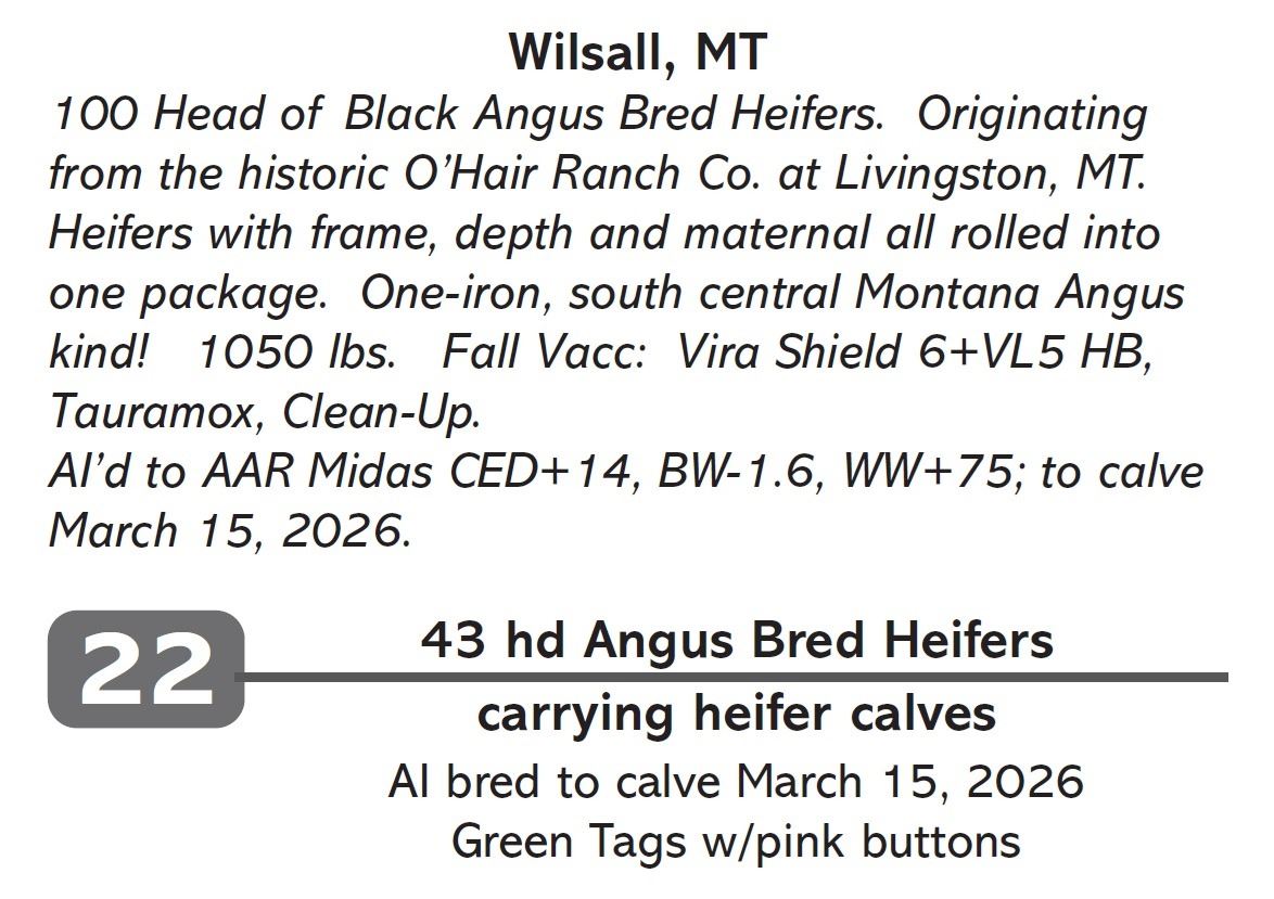 100 Head of Black Angus Bred Heifers. Originating from the historic O’Hair Ranch Co. at Livingston, MT. Heifers with frame, depth and maternal all rolled into one package. One-iron, south central Montana Angus kind! 1050 lbs. Fall Vacc: Vira Shield 6+VL5 HB, Tauramox, Clean-Up.
