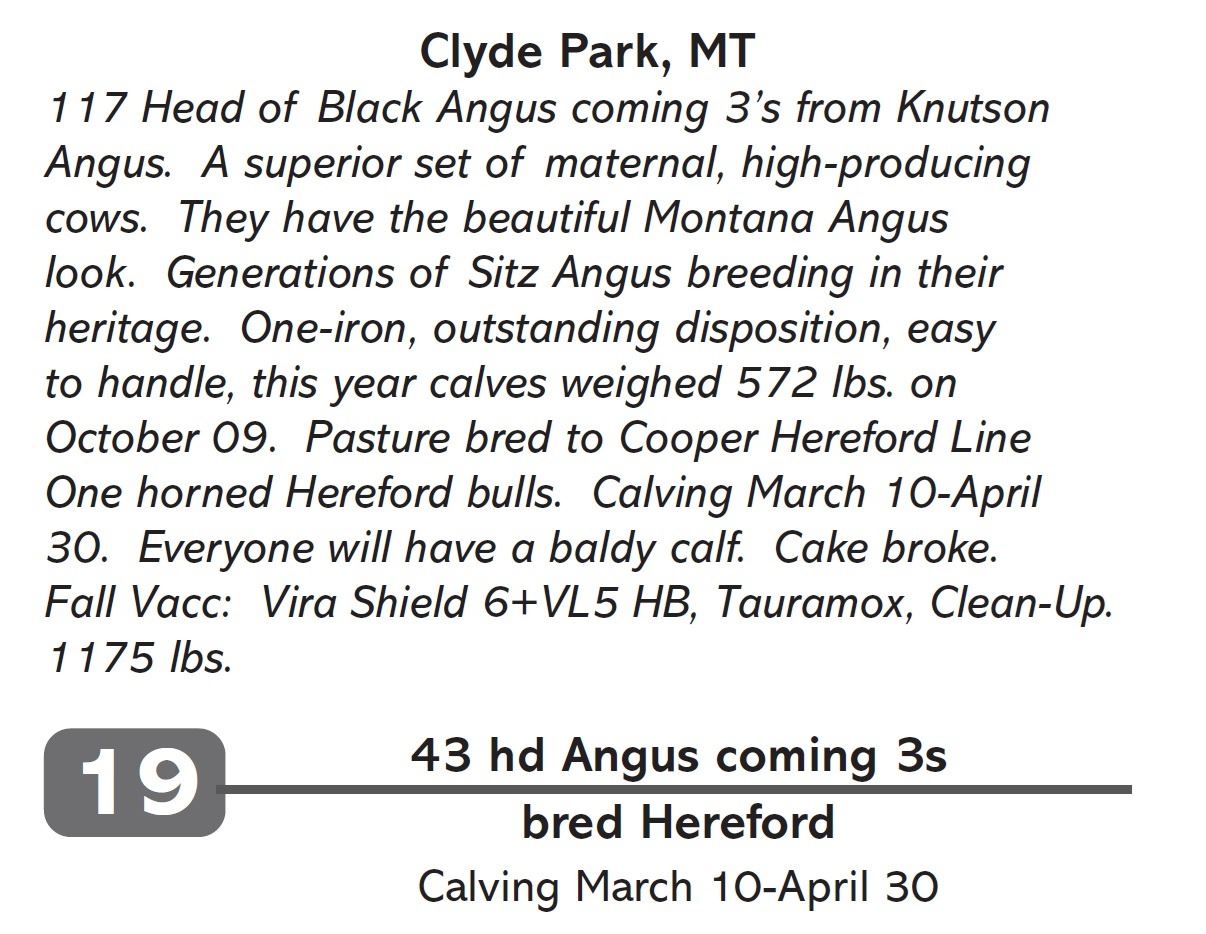 117 Head of Black Angus coming 3’s from Knutson Angus. A superior set of maternal, high-producing cows. They have the beautiful Montana Angus look. Generations of Sitz Angus breeding in their heritage. One-iron, outstanding disposition, easy to handle, this year calves weighed 572 lbs. on October 09. Pasture bred to Cooper Hereford Line One horned Hereford bulls. Calving March 10-April 30. Everyone will have a baldy calf. Cake broke. Fall Vacc: Vira Shield 6+VL5 HB, Tauramox, Clean-Up. 1175 lbs.