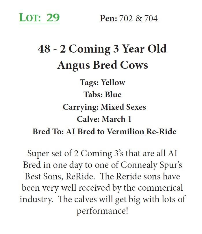Super set of 2 Coming 3’s that are all AI Bred in one day to one of Connealy Spur’s Best Sons, ReRide. The Reride sons have been very well received by the commerical industry. The calves will get big with lots of performance!