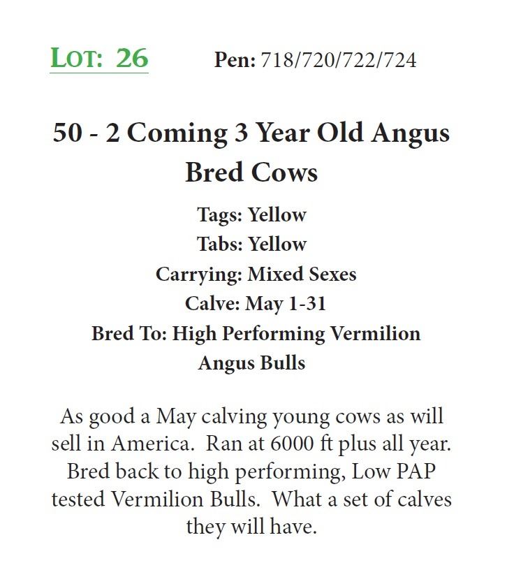 As good a May calving young cows as will sell in America. Ran at 6000 ft plus all year. Bred back to high performing, Low PAP tested Vermilion Bulls. What a set of calves they will have.