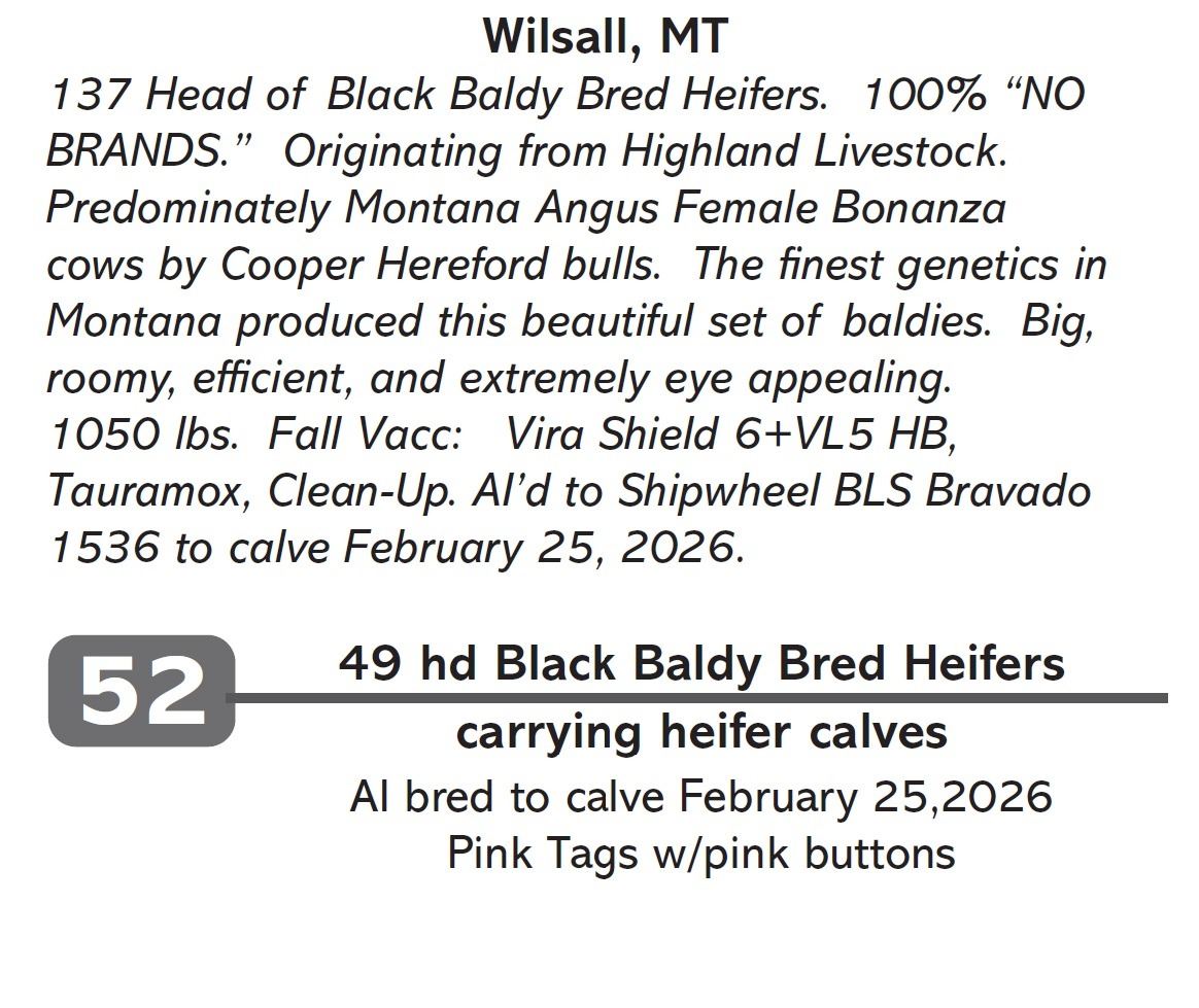 137 Head of Black Baldy Bred Heifers. 100% “NO BRANDS.” Originating from Highland Livestock. Predominately Montana Angus Female Bonanza cows by Cooper Hereford bulls. The finest genetics in Montana produced this beautiful set of baldies. Big, roomy, efficient, and extremely eye appealing.
