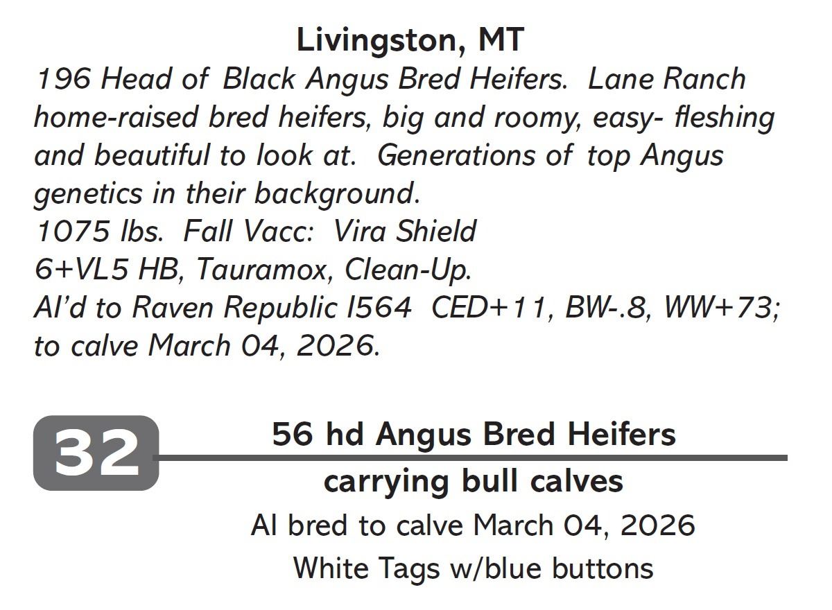196 Head of Black Angus Bred Heifers. Lane Ranch home-raised bred heifers, big and roomy, easy- fleshing and beautiful to look at. Generations of top Angus genetics in their background.