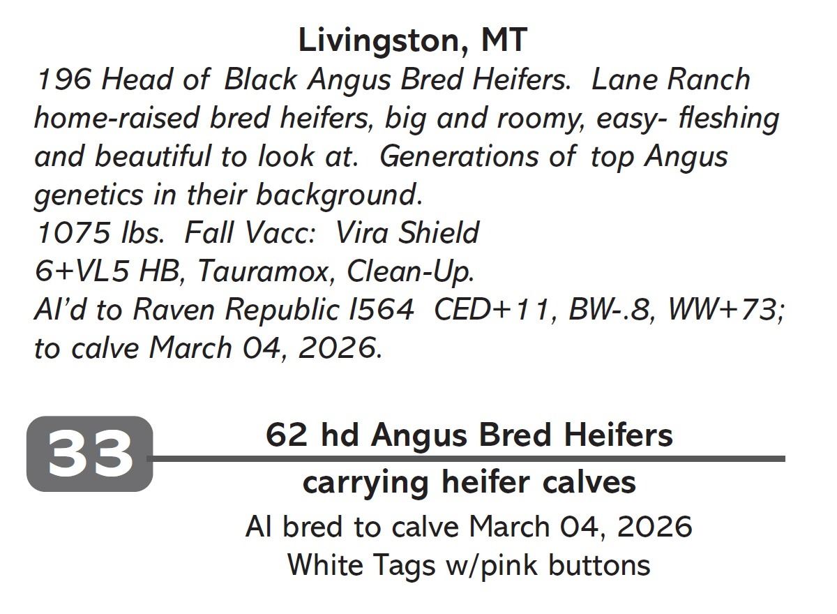 196 Head of Black Angus Bred Heifers. Lane Ranch home-raised bred heifers, big and roomy, easy- fleshing and beautiful to look at. Generations of top Angus genetics in their background.