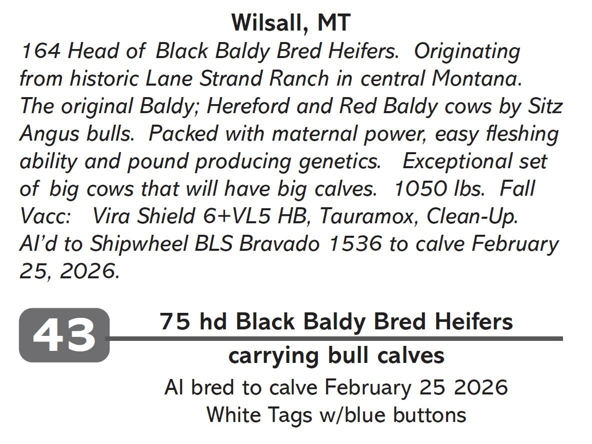 164 Head of Black Baldy Bred Heifers. Originating from historic Lane Strand Ranch in central Montana. The original Baldy; Hereford and Red Baldy cows by Sitz Angus bulls. Packed with maternal power, easy fleshing ability and pound producing genetics. Exceptional set of big cows that will have big calves. 1050 lbs. Fall Vacc: Vira Shield 6+VL5 HB, Tauramox, Clean-Up. AI’d to Shipwheel BLS Bravado 1536 to calve February 25, 2026.