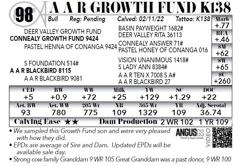 **We sampled this Growth Fund son and were very please with how they did. *EPDs are average of Sire and Dam. Updated EPDs will be available sale day. *Strong cow family Granddam 9 WR 105 Great Granddam was a past donor, 9 WR 100