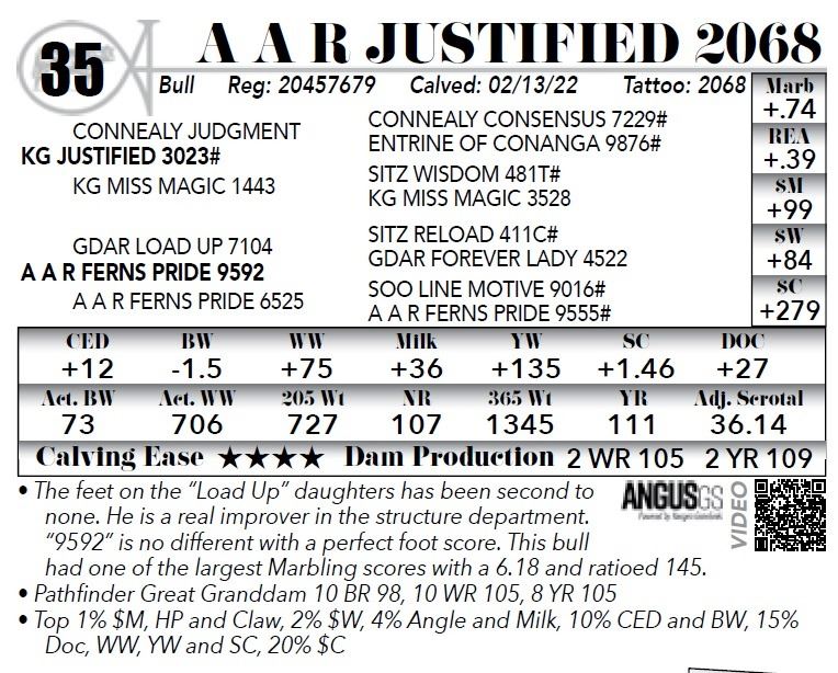 **The feet on the "Load Up" daughters has been second to none. He is a real improver in the structure department. "9592" is no different with a perfect foot score. This bull had one of the largest Marbling scores with a 6.18 and ratioed 145.*Pathfinder Great Granddam 10 BR 98, 10 WR 105, 8 YR 105 *Top 1% $M, HP and Claw, 2% $W, 4% Angle and Milk, 10% CED and BW, 15% Doc, WW, YW and SC, 20% $C
