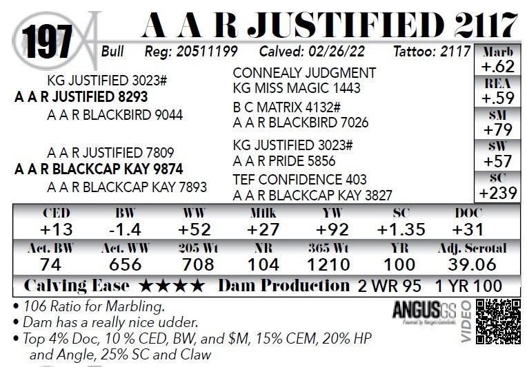 **106 Ratio for Marbling. *Dam has a really nice udder. *Top 4% Doc, 10 % CED, BW, and $M, 15% CEM, 20% HP and Angle, 25% SC and Claw