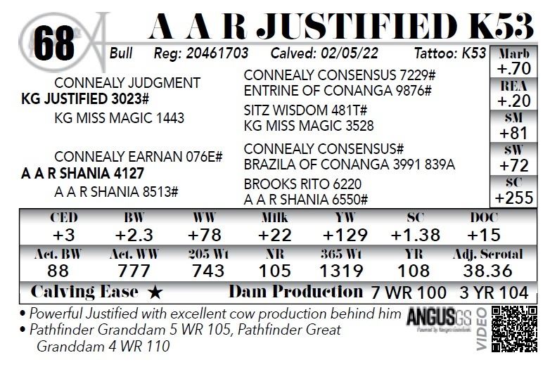 **Powerful Justified with excellent cow production behind him *Pathfinder Granddam 5 WR 105, Pathfinder Great Granddam 4 WR 110