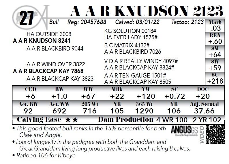 **This good footed bull ranks in the 15% percentile for both Claw and Angle. *Lots of longevity in the pedigree with both the Granddam and Great Granddam living long productive lives and each raising 8 calves. *Ratioed 106 for Ribeye