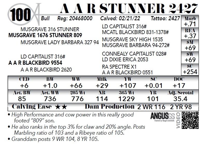 **High Performance and cow power in this really good footed "809" son. *He also ranks in the top 3% for claw and 20% angle. Posts Marbling ratio of 103 and a Ribeye ratio of 105. *Granddam posts 9 WR 104, 8 YR 105.