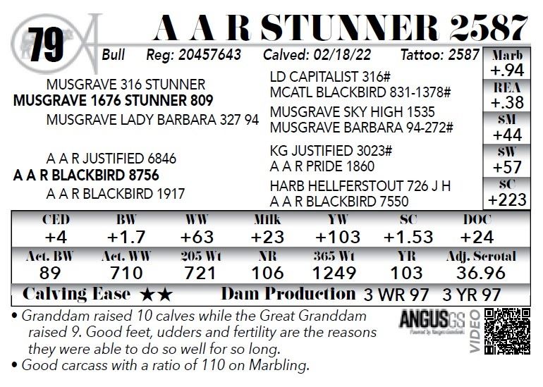 **Granddam raised 10 calves while the Great Granddam raised 9. Good feet, udders and fertility are the reasons they were able to do so well for so long. *Good carcass with a ratio of 110 on Marbling.