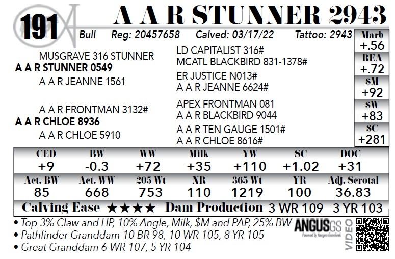 **Top 3% Claw and HP, 10% Angle, Milk, $M and PAP, 25% BW *Pathfinder Granddam 10 BR 98, 10 WR 105, 8 YR 105 *Great Granddam 6 WR 107, 5 YR 104