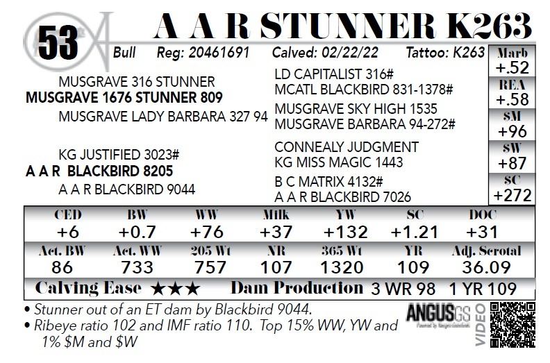 **Stunner out of an ET dam by Blackbird 9044. *Ribeye ratio 102 and IMF ratio 110. Top 15% WW, YW and 1% $M and $W