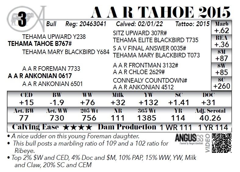 **A nice udder on this young Foreman daughter. * This bull posts a marbling ratio of 109 and a 102 ratio for Ribeye. *Top 2% $W and CED, 4% Doc and $M, 10% PAP, 15% WW, YW, Milkand Claw, 20% SC and CEM