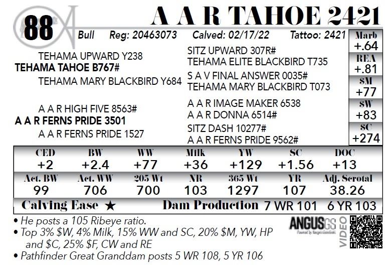 **He posts a 105 Ribeye ratio. *Top 3% $W, 4% Milk, 15% WW and SC, 20% $M, YW, HP and $C, 25% $F, CW and RE *Pathfinder Great Granddam posts 5 WR 108, 5 YR 106