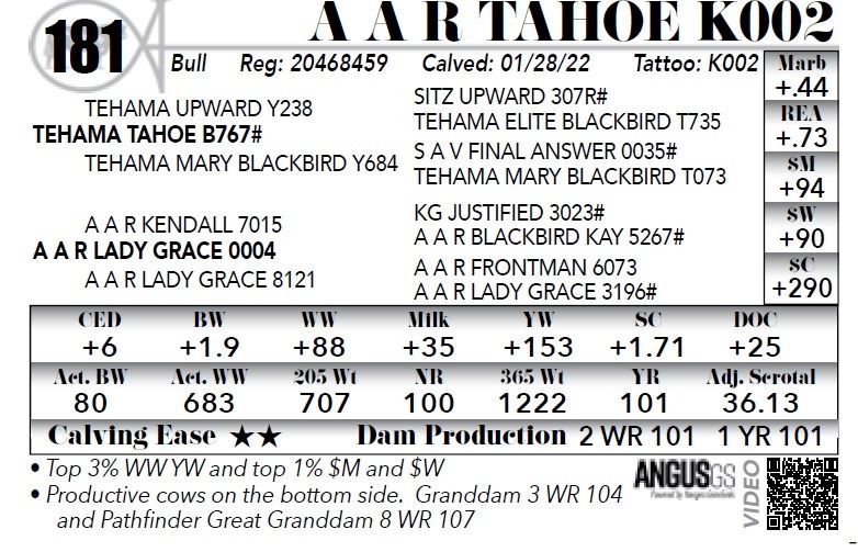 **Top 3% WW YW and top 1% $M and $W *Productive cows on the bottom side. Granddam 3 WR 104 and Pathfinder Great Granddam 8 WR 107