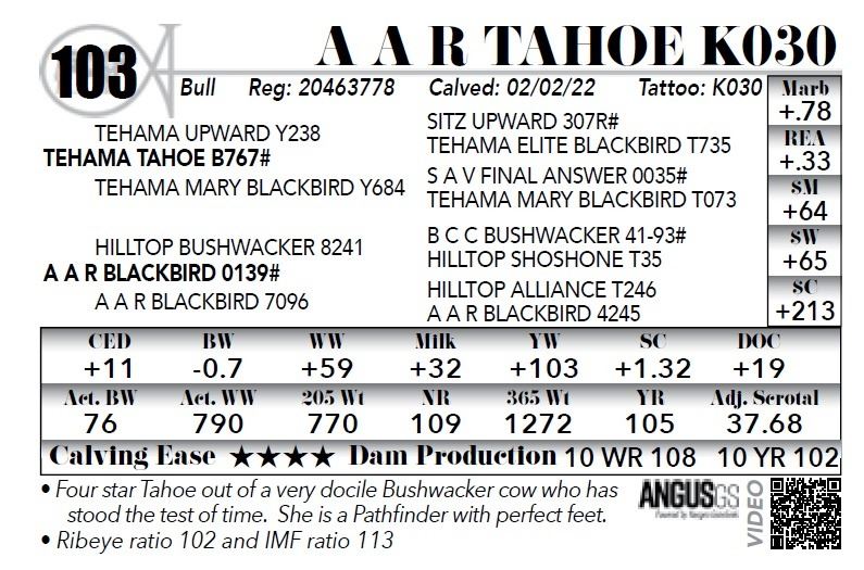 **Four star Tahoe out of a very docile Buschwacker cow who has stood the test of time. She is a pathfinder with perfect feet. *Ribeye ratio 102 and IMF ratio 113