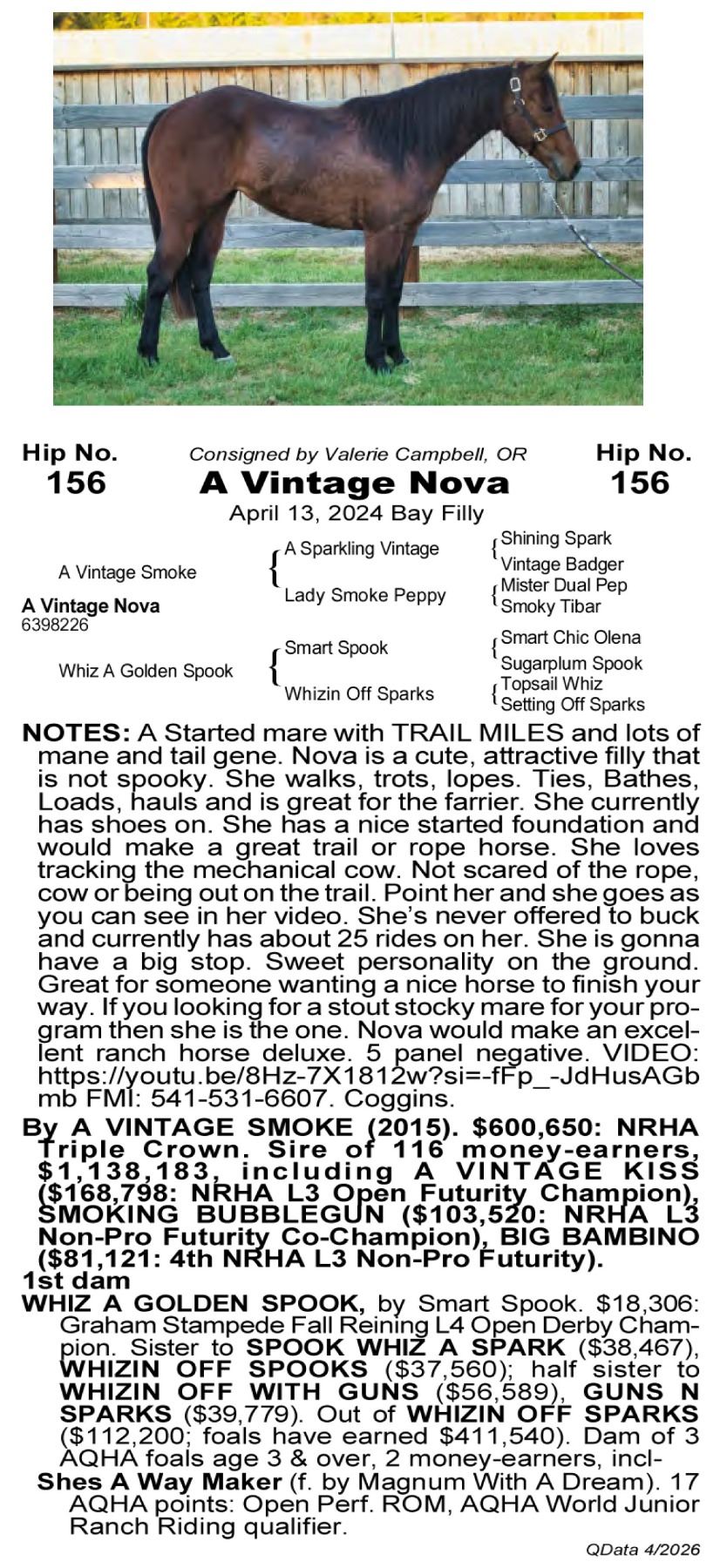 A Vintage Nova -6398226 - 2024 AQHA Bay Mare - Valerie Campbell, Eagle Point, OR - A Started mare with TRAIL MILES and lots of mane and tail gene. Nova is a cute, attractive filly that is not spooky. She walks, trots, lopes. Ties, Bathes, Loads, hauls and is great for the farrier. She currently has shoes on. She has a nice started foundation and would make a great trail or rope horse. She loves tracking the mechanical cow. Not scared of the rope, cow or being out on the trail. Point her and she goes as you can see in her video. She currently has about 25 rides on her and will continue until the sale. She has never offered to buck. She is gonna have a big stop on her. Sweet personality on the ground. Great for someone wanting a nice horse to finish your way. If you looking for a stout stocky mare for your program then she is the one. Nova would make an excellent ranch horse deluxe. 5 panel negative. VIDEO: https://youtu.be/8Hz-7X1812w?si=-fFp_-JdHusAGbmb FMI: 541-531-6607. Coggins.
