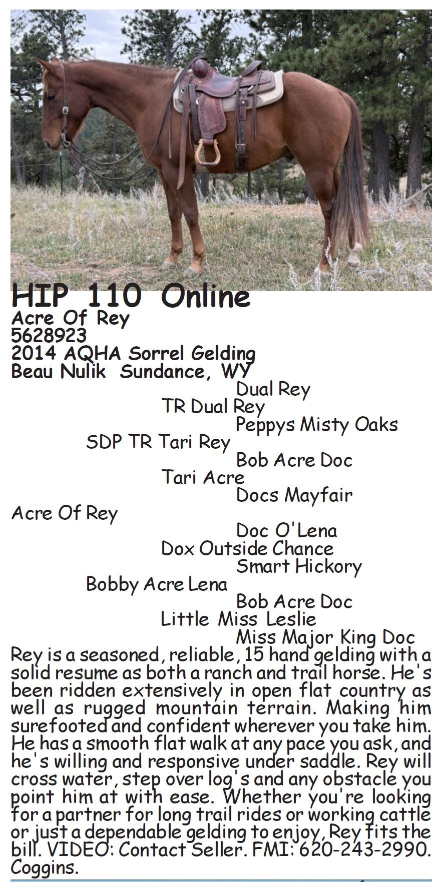 2014 AQHA Sorrel Gelding x SDP TR Tari Rey x TR Dual Rey out of Bobby Acre Lena x Dox Outside Chance. Rey is a seasoned, reliable, 15 hand gelding with a solid resume as both a ranch and trail horse. He's been ridden extensively in open flat country as well as rugged mountain terrain. Making him surefooted and confident wherever you take him. He has a smooth flat walk at any pace you ask, and he's willing and responsive under saddle. Rey will cross water, step over log's and any obstacle you point him at with ease. Whether you're looking for a partner for long trail rides or working cattle or just a dependable gelding to enjoy, Rey fits the bill. VIDEO: Contact Seller. FMI: 620-243-2990. Coggins.