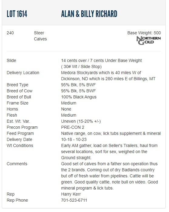 Comments Good set of calves from a father son operation thus the 2 brands. Coming out of dry Badlands country but off of fresh water from pipelines. Cattle will be green. Good quality cattle, note bull on video. Good mineral program & lick tubs.