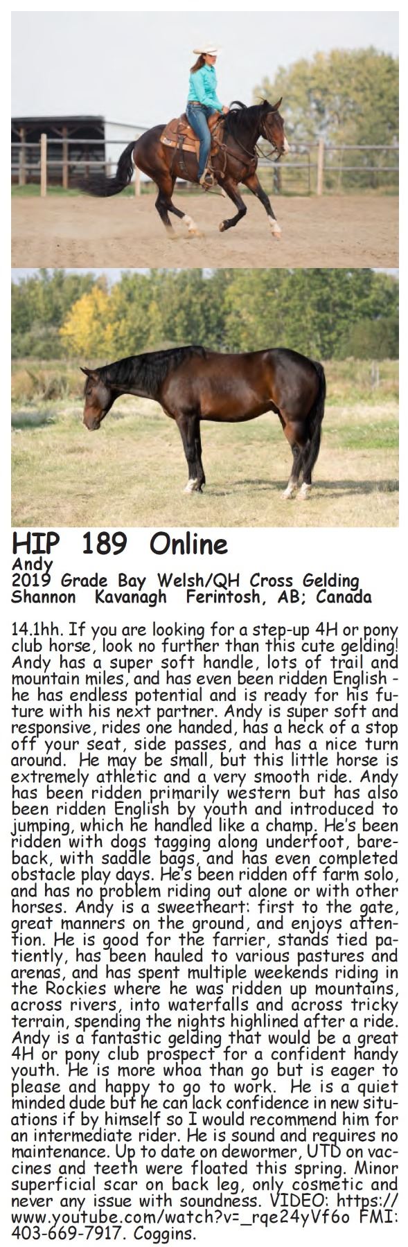 Andy - 2019 Grade Bay Welsh/QH Cross Gelding - Shannon Kavanagh, Ferintosh, AB; Canada - 14.1hh. If you are looking for a step-up 4H or pony club horse, look no further than this cute gelding! Andy has a super soft handle, lots of trail and mountain miles, and has even been ridden English - he has endless potential and is ready for his future with his next partner. Andy is super soft and responsive, rides one handed, has a heck of a stop off your seat, side passes, and has a nice turn around. He may be small, but this little horse is extremely athletic and a very smooth ride. Andy has been ridden primarily western but has also been ridden English by youth and introduced to jumping, which he handled like a champ. He’s been ridden with dogs tagging along underfoot, bareback, with saddle bags, and has even completed obstacle play days. He’s been ridden off farm solo, and has no problem riding out alone or with other horses. Andy is a sweetheart: first to the gate, great manners on the ground, and enjoys attention. He is good for the farrier, stands tied patiently, has been hauled to various pastures and arenas, and has spent multiple weekends riding in the Rockies where he was ridden up mountains, across rivers, into waterfalls and across tricky terrain, spending the nights highlined after a ride. Andy is a fantastic gelding that would be a great 4H or pony club prospect for a confident handy youth. He is more whoa than go but is eager to please and happy to go to work. He is a quiet minded dude but he can lack confidence in new situations if by himself so I would recommend him for an intermediate rider. He is sound and requires no maintenance. Up to date on dewormer, UTD on vaccines and teeth were floated this spring. Minor superficial scar on back leg, only cosmetic and never any issue with soundness. VIDEO: https://www.youtube.com/watch?v=_rqe24yVf6o FMI: 403-669-7917. Coggins.