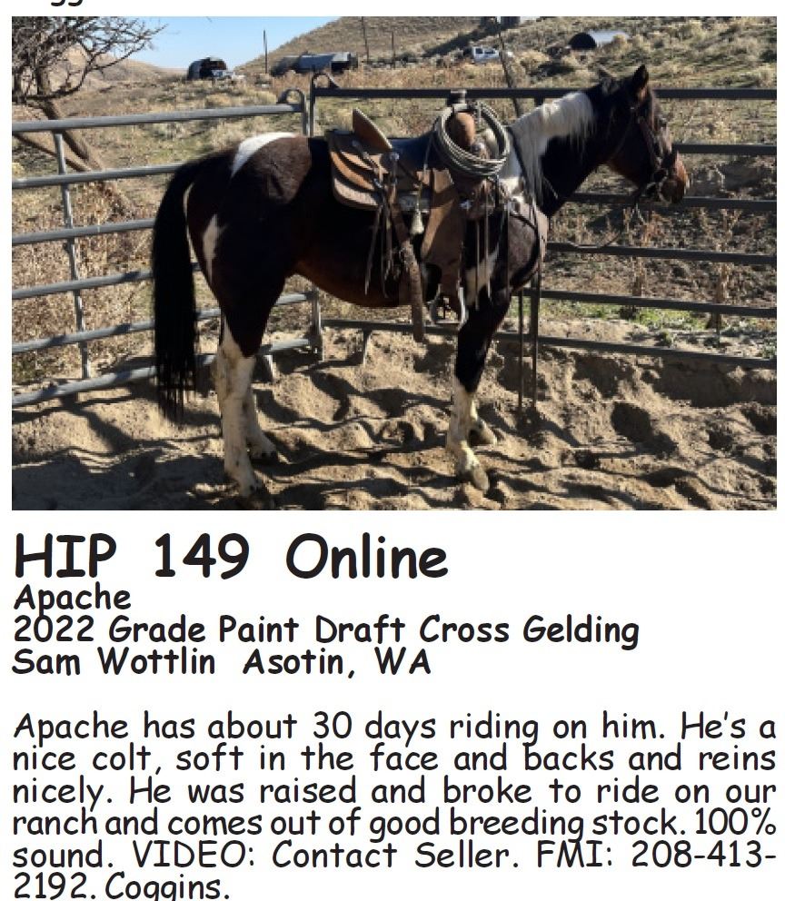 Apache has about 30 days riding on him. He’s a nice colt, soft in the face and backs and reins nicely. He was raised and broke to ride on our ranch and comes out of good breeding stock. 100% sound. VIDEO: Contact Seller. FMI: 208-413-2192. Coggins.