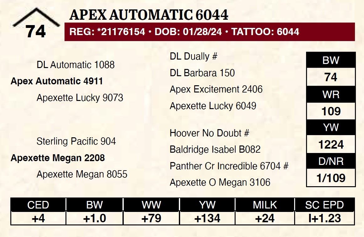 All persons who attend this sale do so at their own risk, legal or otherwise. Apex Angus assumes no liability for property loss or accident that may occur.