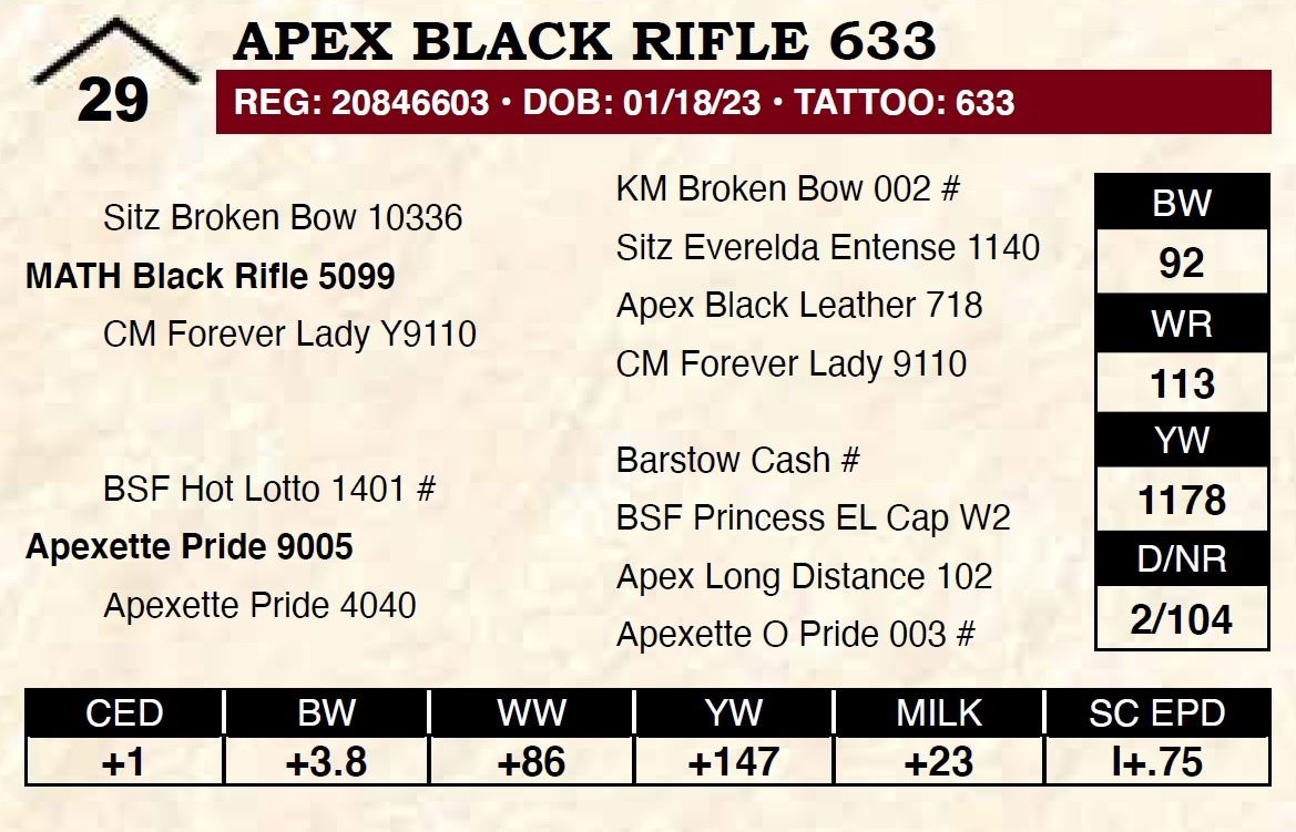 All persons who attend this sale do so at their own risk, legal or otherwise. Apex Angus assumes no liability for property loss or accident that may occur.