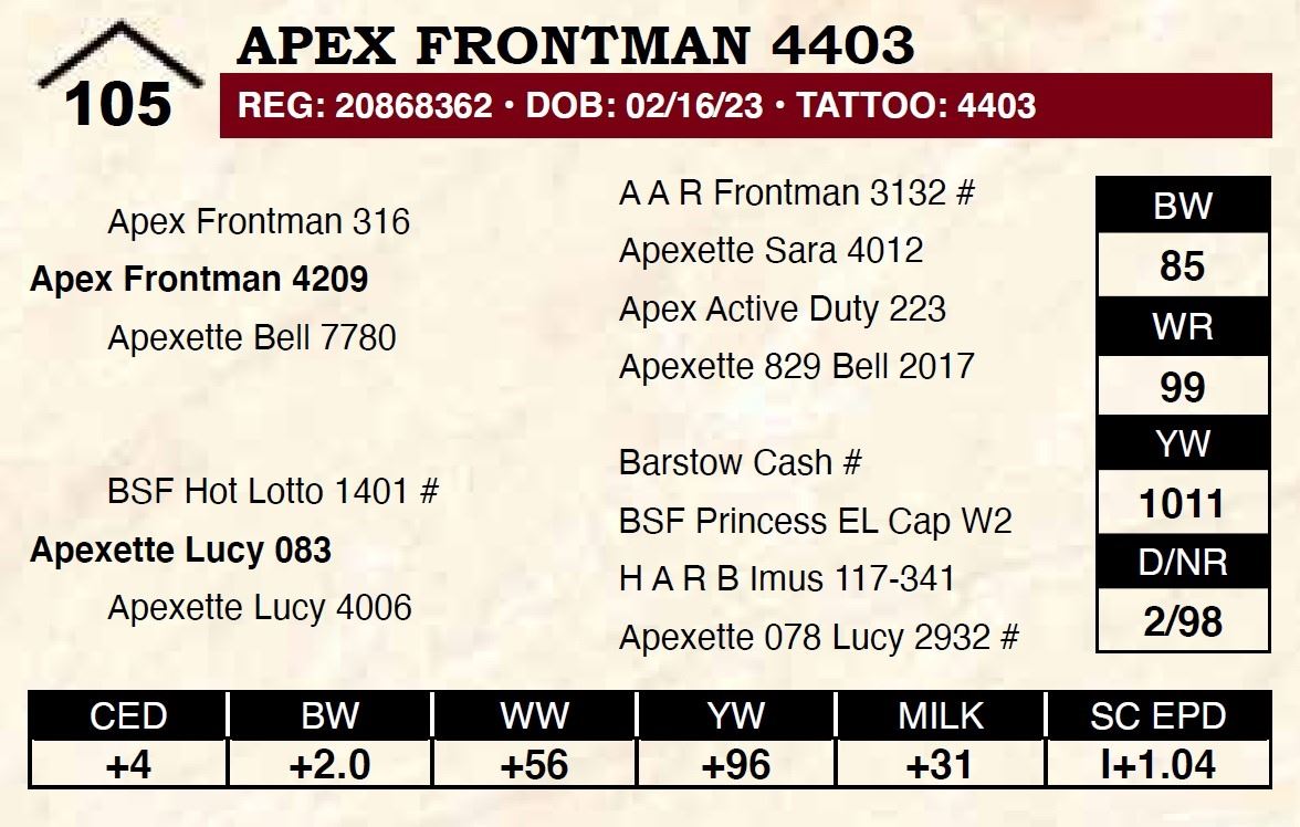 All persons who attend this sale do so at their own risk, legal or otherwise. Apex Angus assumes no liability for property loss or accident that may occur.