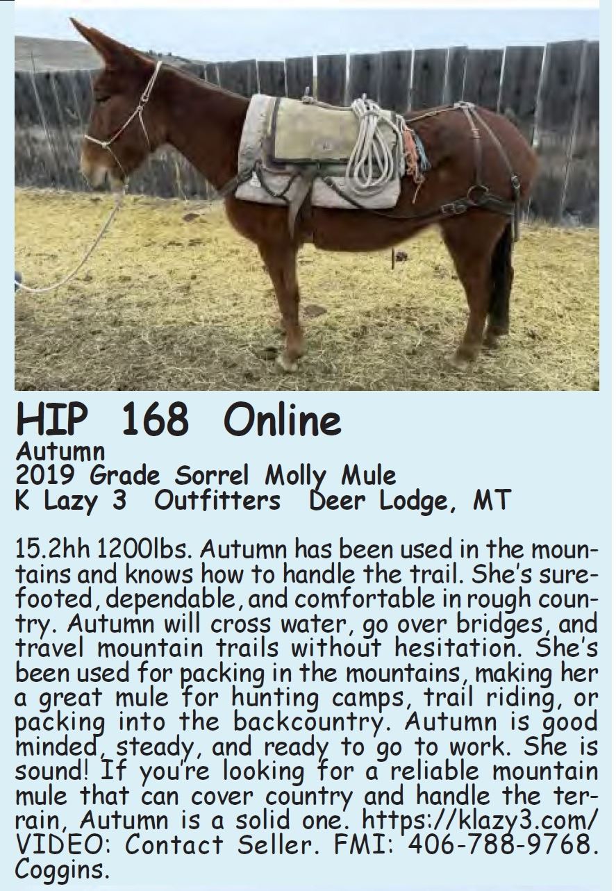 Autumn - 2019 Grade Sorrel Molly Mule - K Lazy 3 Outfitters, Deer Lodge, MT - 15.2hh 1200lbs. Autumn has been used in the mountains and knows how to handle the trail. She’s sure-footed, dependable, and comfortable in rough country. Autumn will cross water, go over bridges, and travel mountain trails without hesitation. She’s been used for packing in the mountains, making her a great mule for hunting camps, trail riding, or packing into the backcountry. Autumn is good minded, steady, and ready to go to work. She is sound! If you’re looking for a reliable mountain mule that can cover country and handle the terrain, Autumn is a solid one. https://klazy3.com/ VIDEO: Contact Seller. FMI: 406-788-9768. Coggins.