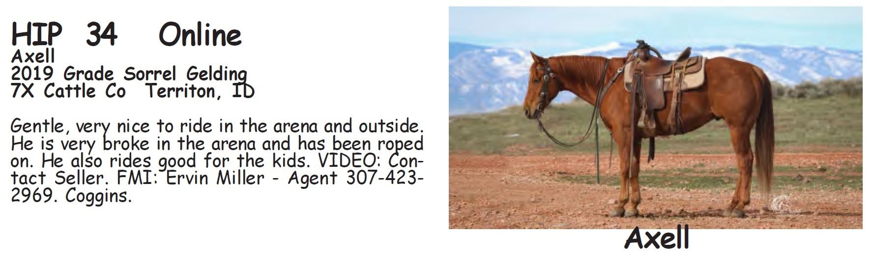 Axell - 2019 Grade Sorrel Gelding - 7X Cattle Co, Territon, ID - Gentle, very nice to ride in the arena and outside. He is very broke in the arena and has been roped on. He also rides good for the kids. VIDEO: Contact Seller. FMI: Ervin Miller - Agent 307-423-2969. Coggins.