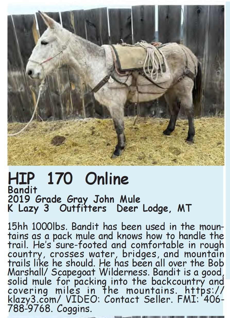 Bandit - 2019 Grade Gray John Mule - K Lazy 3 Outfitters, Deer Lodge, MT - 15hh 1000lbs. Bandit has been used in the mountains as a pack mule and knows how to handle the trail. He’s sure-footed and comfortable in rough country, crosses water, bridges, and mountain trails like he should. He has been all over the Bob Marshall/ Scapegoat Wilderness. Bandit is a good, solid mule for packing into the backcountry and covering miles in the mountains. https://klazy3.com/ VIDEO: Contact Seller. FMI: 406-788-9768. Coggins.