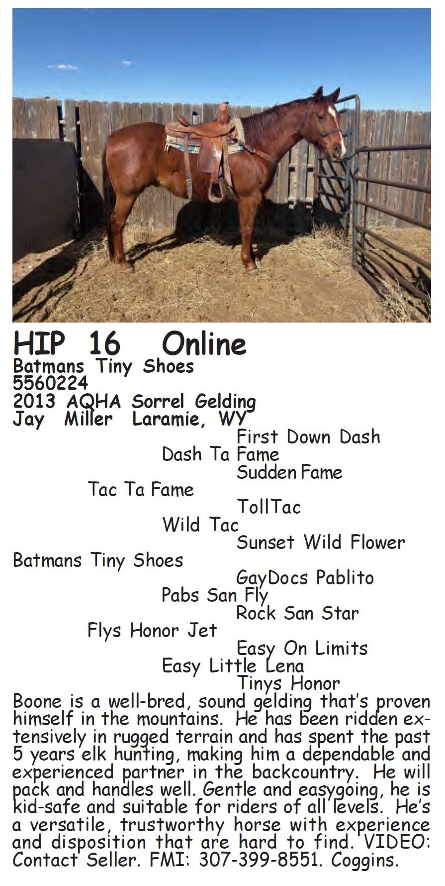 Batmans Tiny Shoes - 5560224 - 2013 AQHA Sorrel Gelding - Jay Miller, Laramie, WY - Boone is a well-bred, sound gelding that’s proven himself in the mountains. He has been ridden extensively in rugged terrain and has spent the past 5 years elk hunting, making him a dependable and experienced partner in the backcountry. He will pack and handles well. Gentle and easygoing, he is kid-safe and suitable for riders of all levels. He’s a versatile, trustworthy horse with experience and disposition that are hard to find. VIDEO: Contact Seller. FMI: 307-399-8551. Coggins.