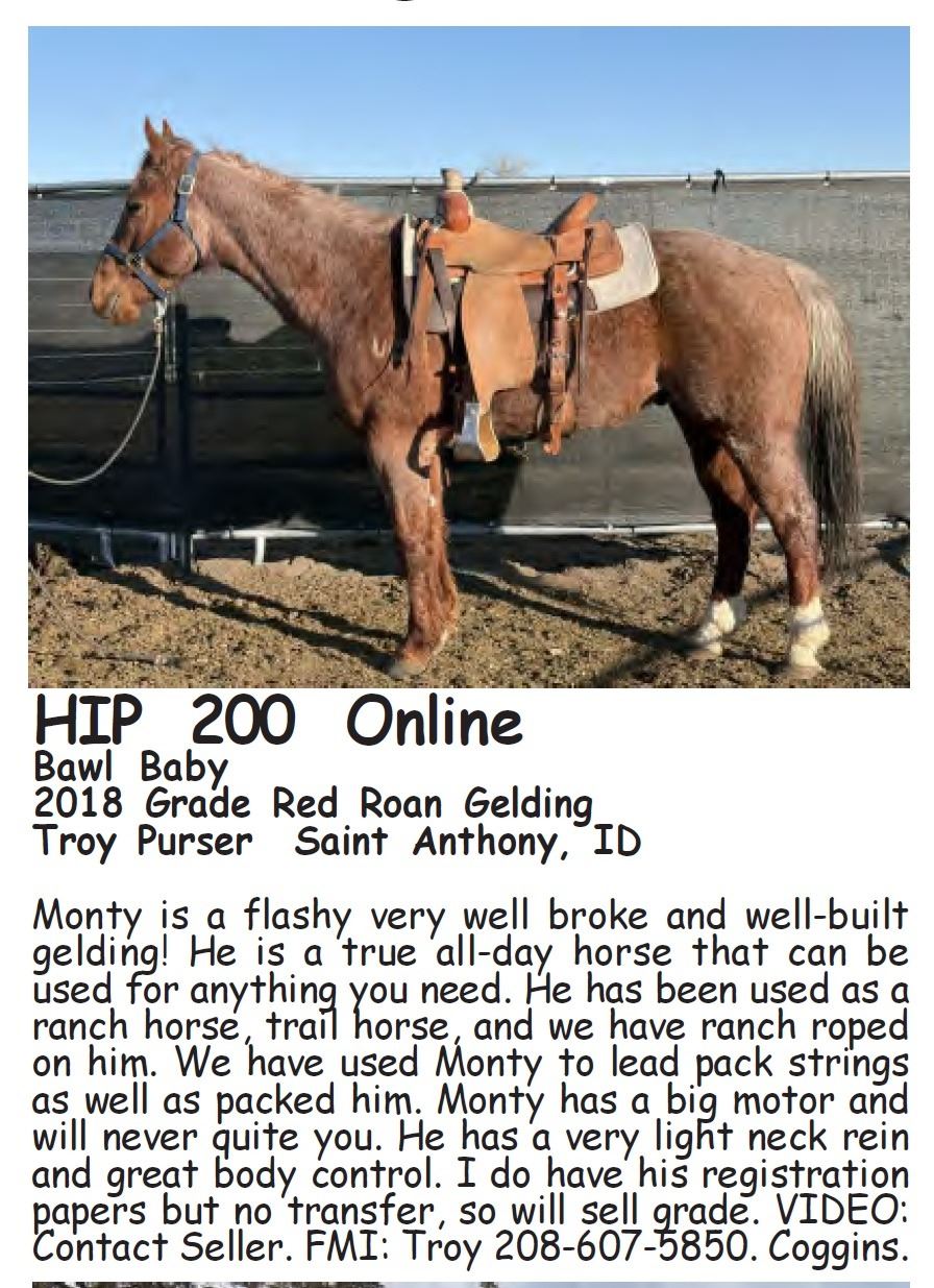 Bawl Baby - 2018 Grade Red Roan Gelding - Troy Purser, Saint Anthony, ID - Monty is a flashy very well broke and well-built gelding! He is a true all-day horse that can be used for anything you need. He has been used as a ranch horse, trail horse, and we have ranch roped on him. We have used Monty to lead pack strings as well as packed him. Monty has a big motor and will never quite you. He has a very light neck rein and great body control. I do have his registration papers but no transfer, so will sell grade. VIDEO: Contact Seller. FMI: Troy 208-607-5850. Coggins.